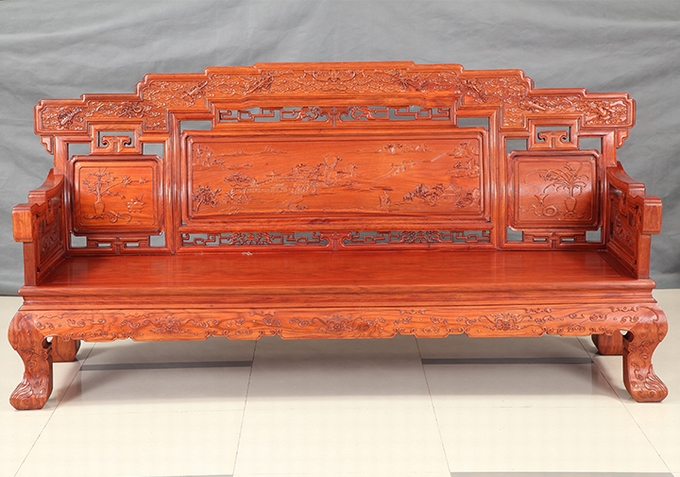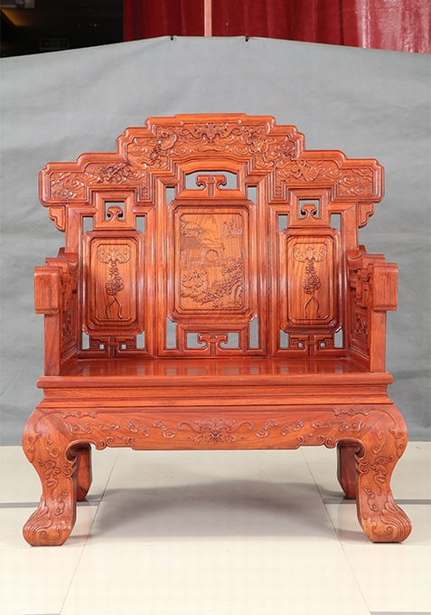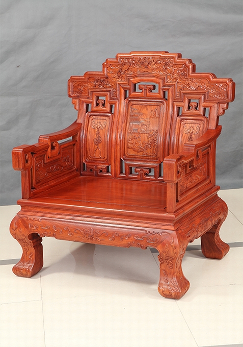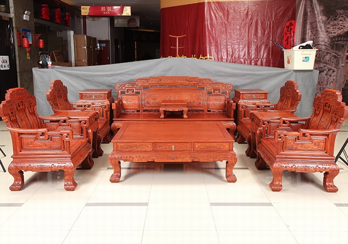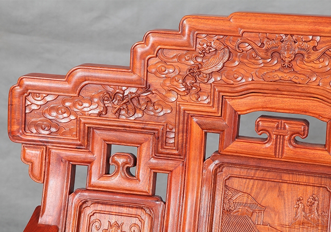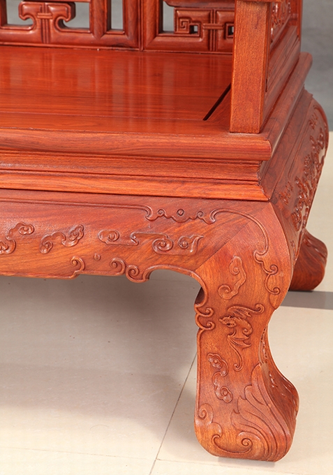 而今天,我們福林堂紅木要為大家介紹的這一款沙發(fā)——祥云寶座沙發(fā),即是這樣一款以之祥云為主要裝飾圖案,附之以蝙蝠、銅錢、磬(Qing)、八寶、行龍紋、魚紋、如意等多種象征寓意紋飾組合而成,另外沙發(fā)整體之外觀仿照古代帝王之寶座外觀設計,顯得十分地氣派張揚與尊貴,十分適合給那些身份及地位都十分顯赫、重要的人物使用,是一座尊貴的席位,在家中擺放之就好比如置入一座寶座一番,給人以一種沉穩(wěn)、大氣、威嚴之感受,而這一類風格之家居也正是當下仿古式紅木家具中應用十分廣泛的一類,只不過它現(xiàn)在已經不再顯得那么高高在上的了,而是可以配之以高幾、角幾與大平幾一起使用,感受上更覺舒適平和自然,成為一處可以與普通老百姓一起相陪作伴的普通家居陳設用品。