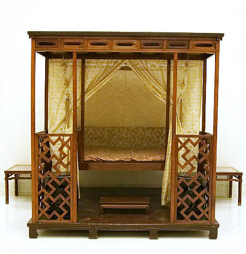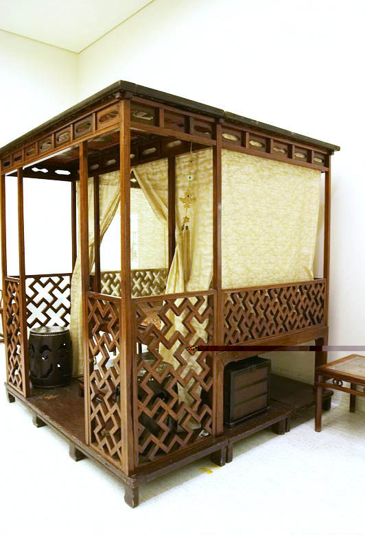 拔步床簡(jiǎn)直就是個(gè)小房子,是建在木質(zhì)地坪上的房中房。床的四周掛上帷幔,是極為私密的空間。有些甚至幾重帷幔,連床前的門廊也遮掩起來,冬天是和暖的溫床,夏天驅(qū)避蚊蟲襲擾,在南方使用較多。