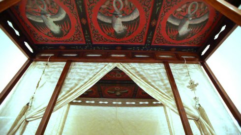現(xiàn)在這張完美的床,陳列于展室的重心位置,并按照使用的樣子鋪設(shè)床褥,掛著幔帳,廊上置腳踏及坐墩。按說另一側(cè)應(yīng)該放個(gè)梳妝臺(tái)鏡匣,若是納爾遜有的話,一定會(huì)如此陳設(shè)一番。