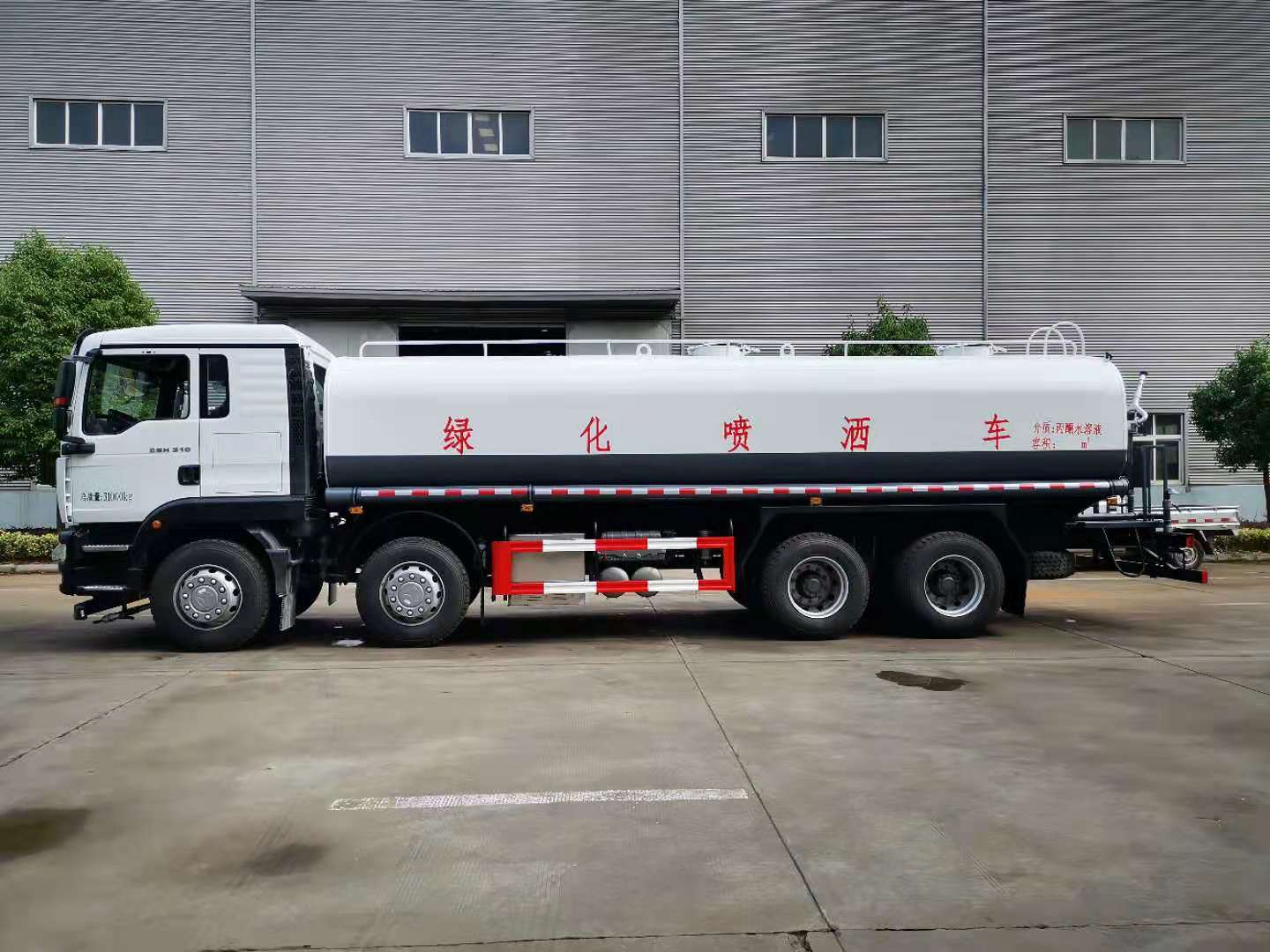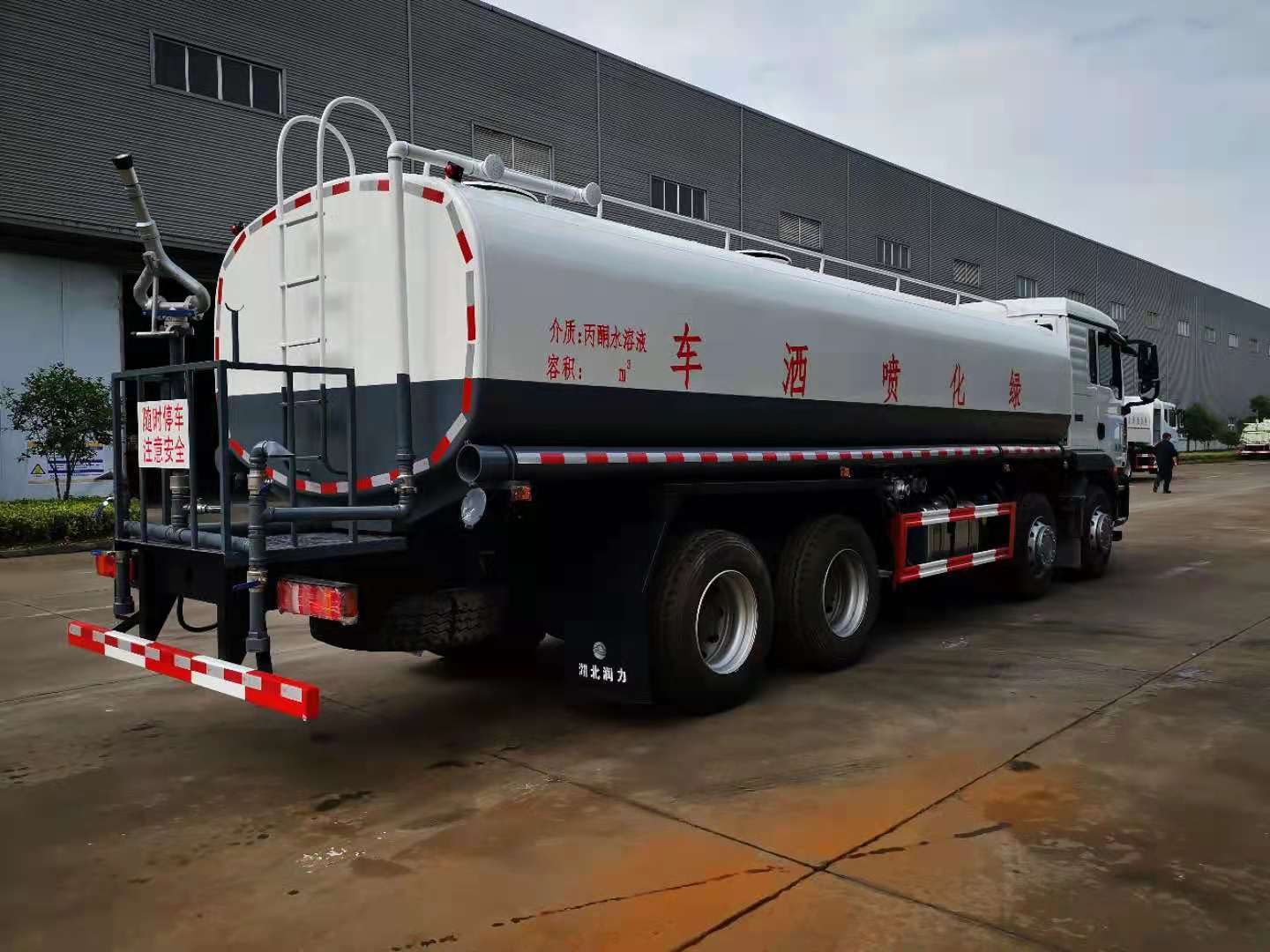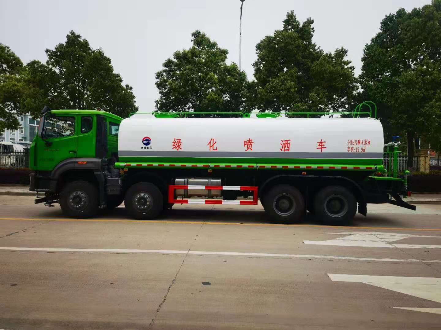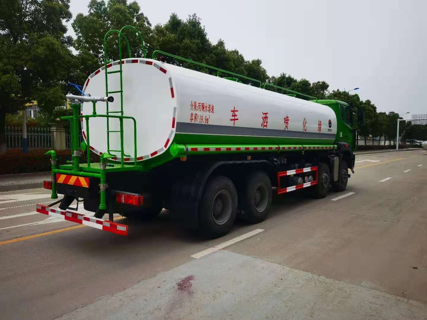 罐體容積25立方,采用國(guó)標(biāo)4mm鋼板,內(nèi)有隔板,采用60/90灑水泵,可抽可排,前噴后灑,帶側(cè)噴,后平臺(tái)高射水泡,射程25m右側(cè)兩個(gè)高位花灑,罐體顏色白/綠,采用優(yōu)質(zhì)油漆,其它按灑水車要求生產(chǎn)。