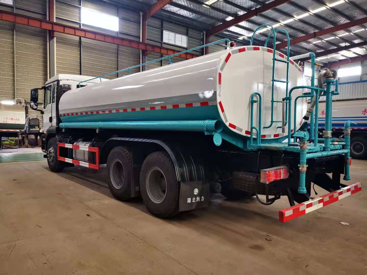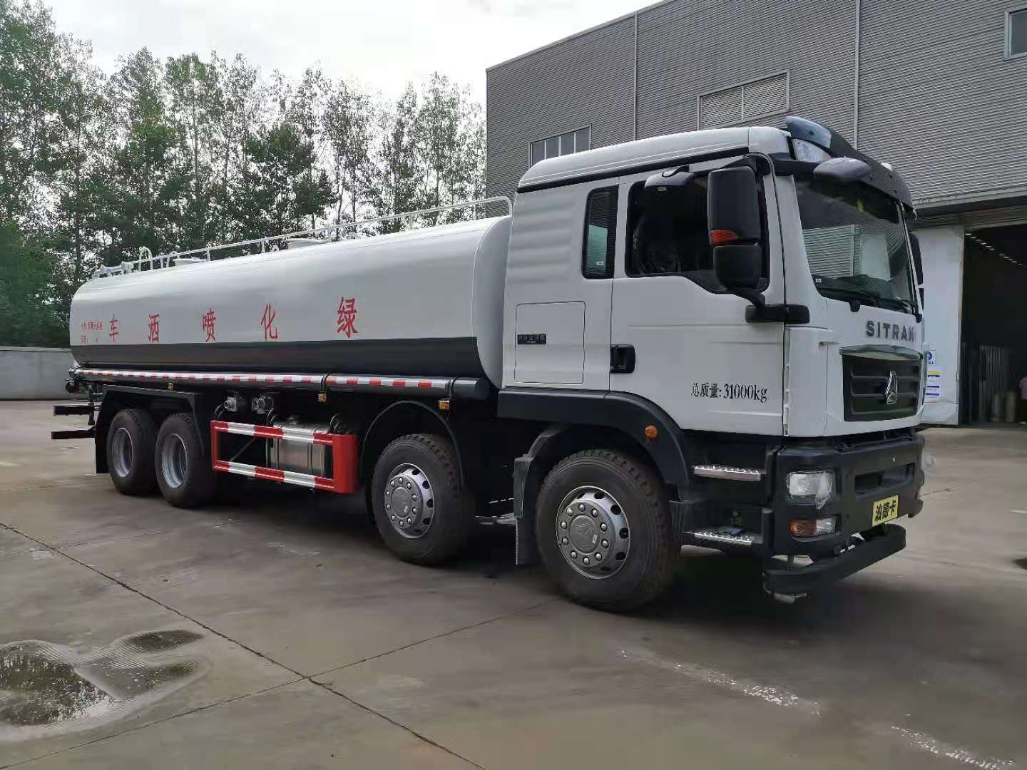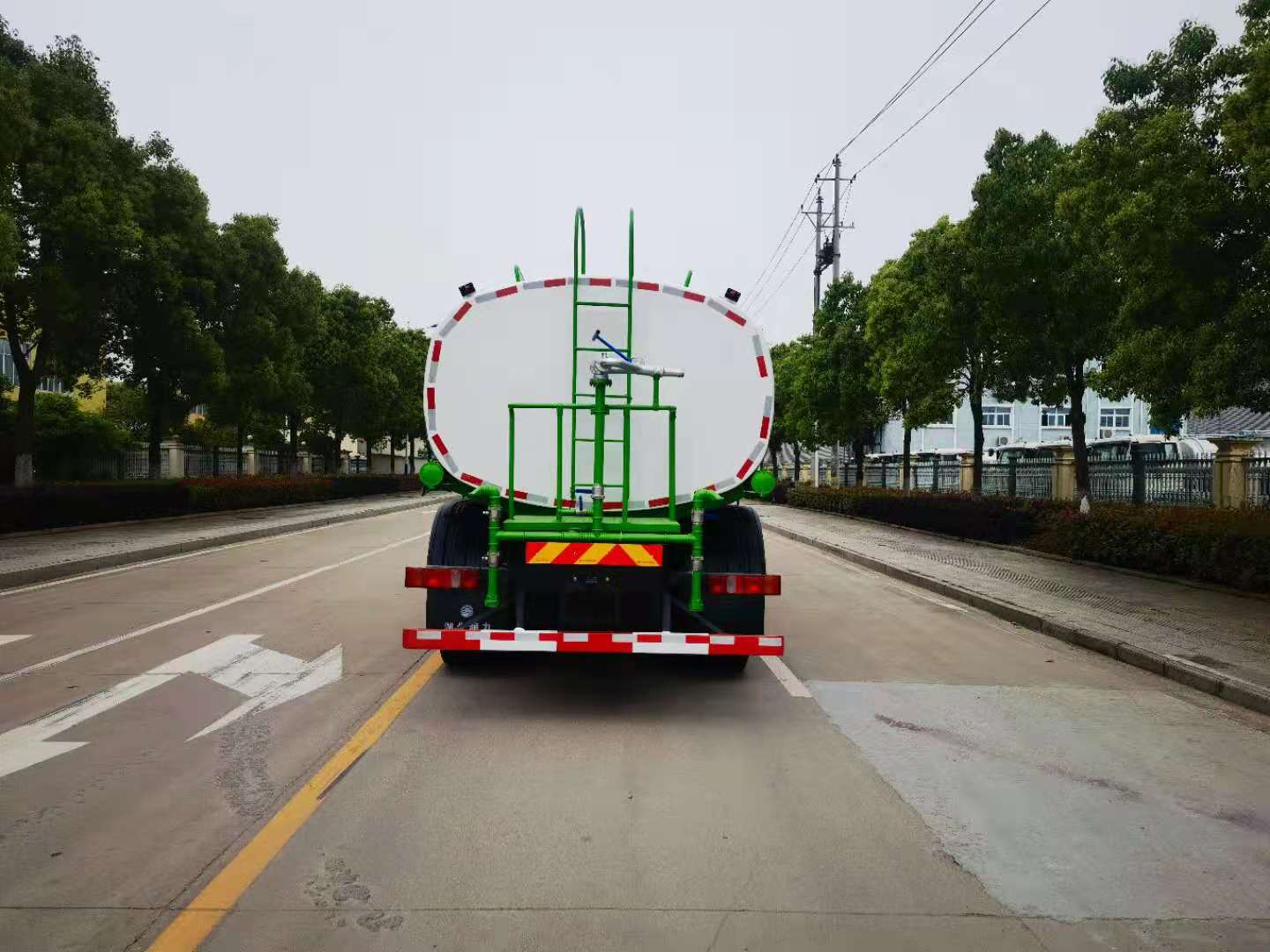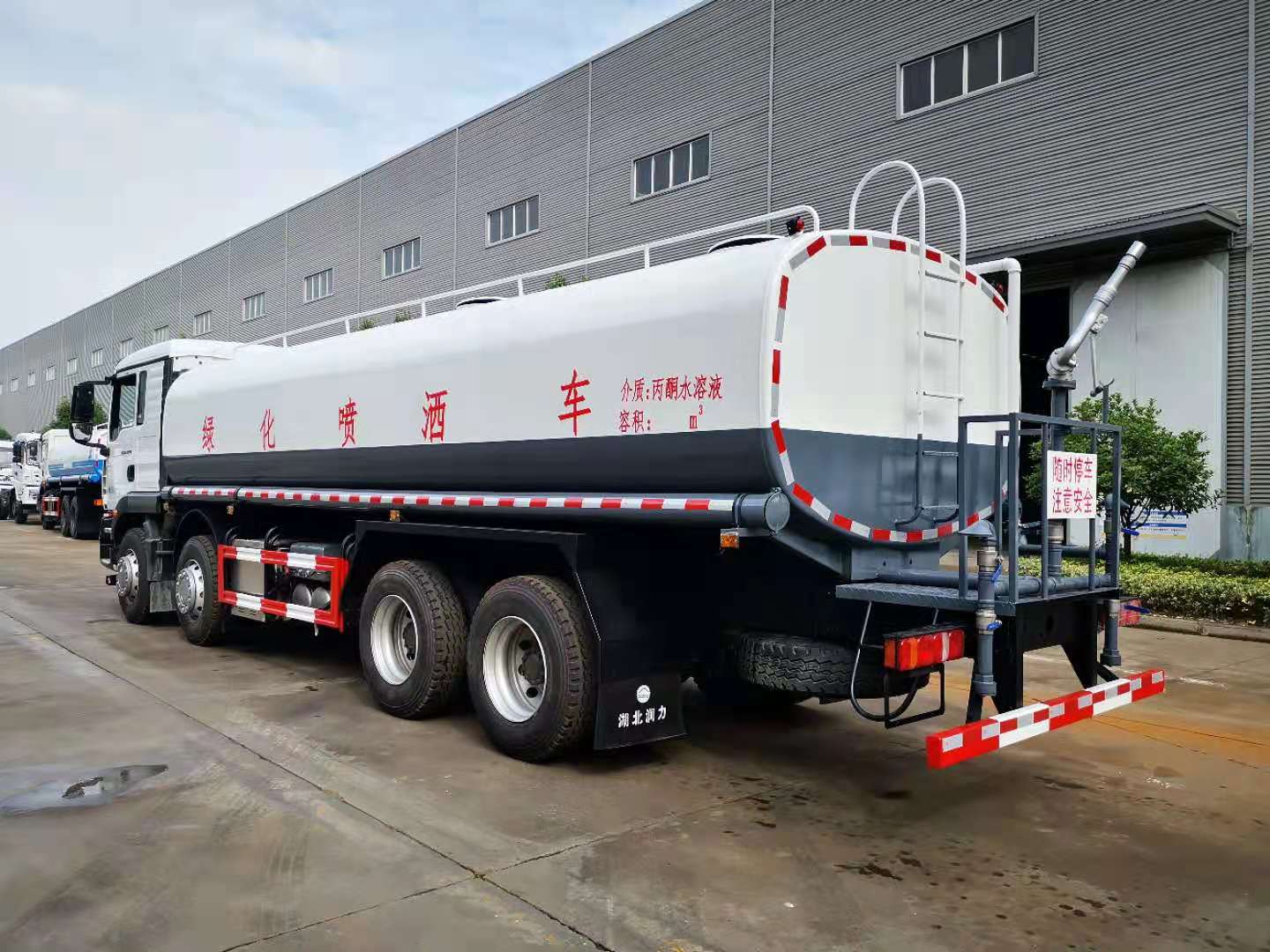 罐體容積25立方,采用國(guó)標(biāo)4mm鋼板,內(nèi)有隔板,采用60/90灑水泵,可抽可排,前噴后灑,帶側(cè)噴,后平臺(tái)高射水泡,射程25m右側(cè)兩個(gè)高位花灑,罐體顏色白/綠,采用優(yōu)質(zhì)油漆,其它按灑水車要求生產(chǎn)。